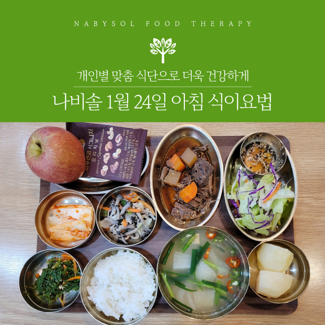 아침 : 홍합부추국/ 소고기장조림/느타리버섯볶음/세발나물무침/양상추샐러드/사과&견과류